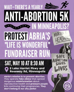 Join us in protesting the “Life is Wonderful” run on May 10th. This fundraiser for Abria Pregnancy Resources, a predatory crisis pregnancy center, has no place in our city parks!