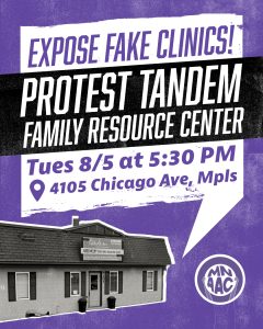Will you join us letting the neighborhood know that Tandem is a fake clinic? Join us for a protest outside their doors on Tuesday, August 5th! Lies and deception have no place in our communities. We need real reproductive healthcare!